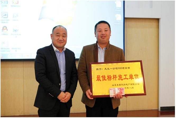 會(huì)上,公司副總經(jīng)理、質(zhì)量檢查組組長(zhǎng)班磊以PPT的形式,結(jié)合各項(xiàng)目日常表現(xiàn)總結(jié)分析了2015年度工程檢查中各項(xiàng)目體現(xiàn)的亮點(diǎn)和不足。并對(duì)表現(xiàn)突出的金泰華府南地塊27#樓承建單位天元102項(xiàng)目部進(jìn)行了表彰。