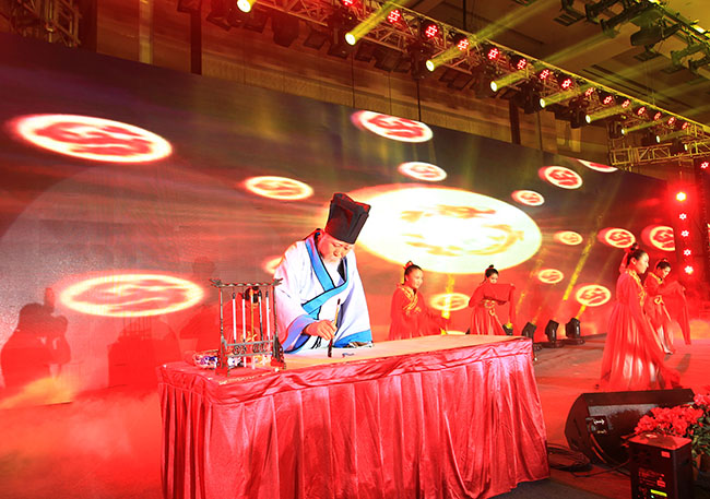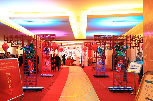 本次晚會采用中國傳統文化的主題,參會人員著中國風禮服入場,現場布置也透著濃厚的中國風味,迎賓大道的黃色地毯、道路兩旁的燈籠、鏤空的大紅門、綠瓦白墻的合影區……隨處可見的中國傳統文化元素讓參會人員欣喜不已,紛紛駐足拍照留念。