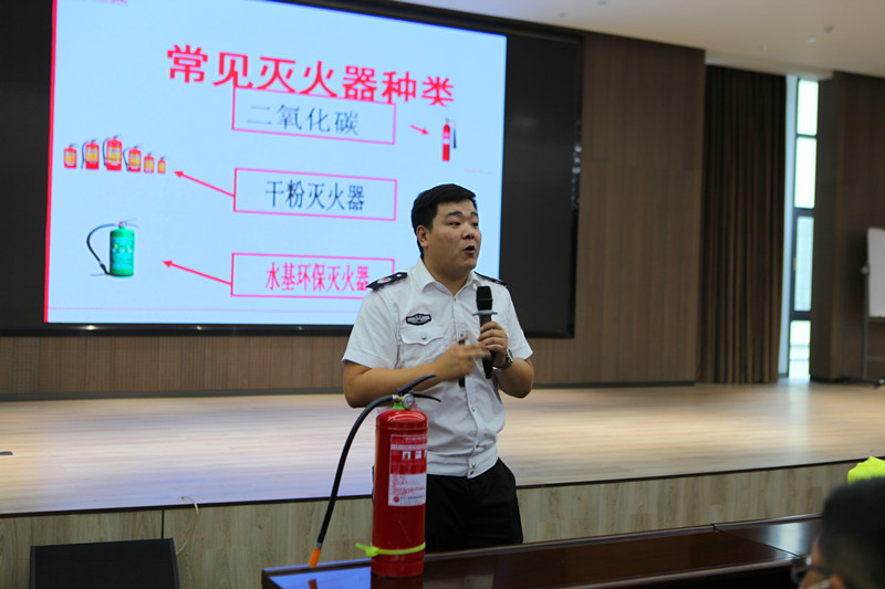 遲永春為參會人員介紹常見滅火器的特點及使用方法